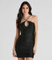 Clearly. this satin mini dress is a gem! Dare to go bold in this sultry halter dress featuring a sleeveless ruched bodice with adjustable spaghetti straps. rhinestone insets. and a front keyhole that leads to a bodycon silhouette. Complete the look in glam heels for dinner and dancing.