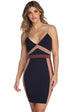 Color block it up with this stunning mini dress! It features a sleeveless bodice. thin bungee straps. a V neckline. a high waist seam. and a short. curve hugging fit. The navy blue dress is composed of an unlined crepe fabric with plenty of stretch and showcases a color block pattern with hues of beige and mauve.
