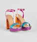 Have the most colorful steps in these metallic block heels for parties and celebrations! They feature a square toe. a three toe strap. platform sole. and an adjustable ankle strap with buckle closure. Complete the look with a clutch.
