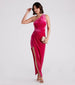 Soft. luxe velvet crafts the Connie formal dress to make a flawless appearance on bridesmaids and dressy events! She features a sleeveless one-shoulder neckline. a wide shoulder strap. a pleated bodice. and a form-hugging asymmetrical long hem with a sexy high-side slit. The formal dress is composed of velvet fabric with a stretchy knit lining and moderate stretch. Style with a chic clutch and earrings to complete the look.