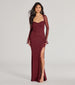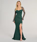 The Connie glitter formal dress features sheer long fitted sleeves with flared slit cuffs for drama. a sweetheart neckline. padded bra cups for support. and a high front slit along the floor-length column silhouette. Perfect for styling with jewelry and heels.