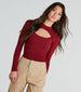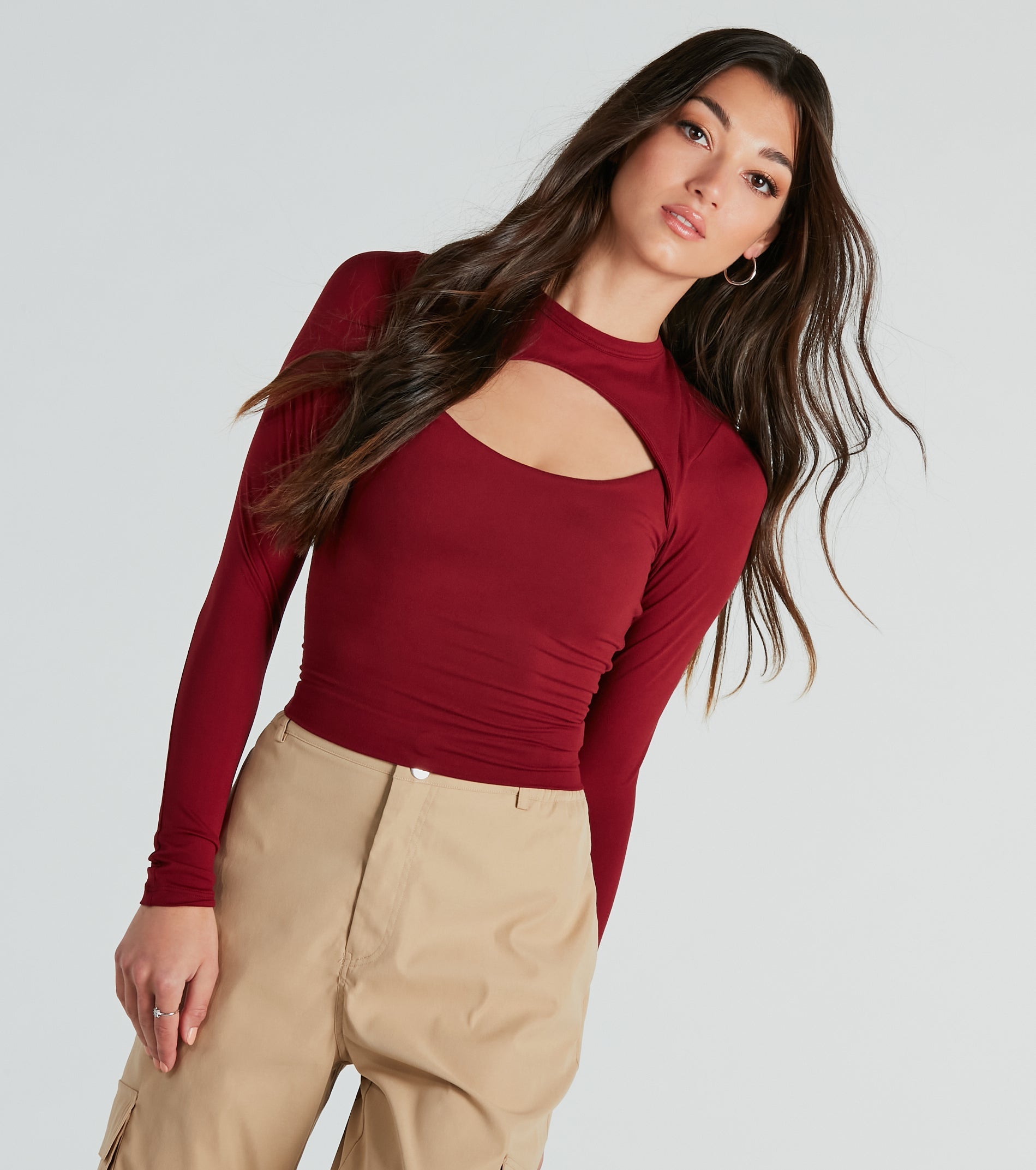 Give off major cool-girl energy in this elevated cutout long sleeve top. Designed with a stretchy knit fabric. it features a crew neckline with a trendy cutout above the bust. long fitted sleeves. and a fitted mid-length hem. Style this top with cargo pants for a casual-chic vibe!