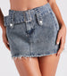 You'll be in your cool-girl era with this on-trend edgy denim mini skirt! It features a mid-rise waist. a wide belt with a rectangular buckle and button detailing on the front belt loops. back pockets. a mini-length hem with a frayed edge. and a fitted silhouette. Style with a crop top and cowboy boots for bar-hopping with your squad.