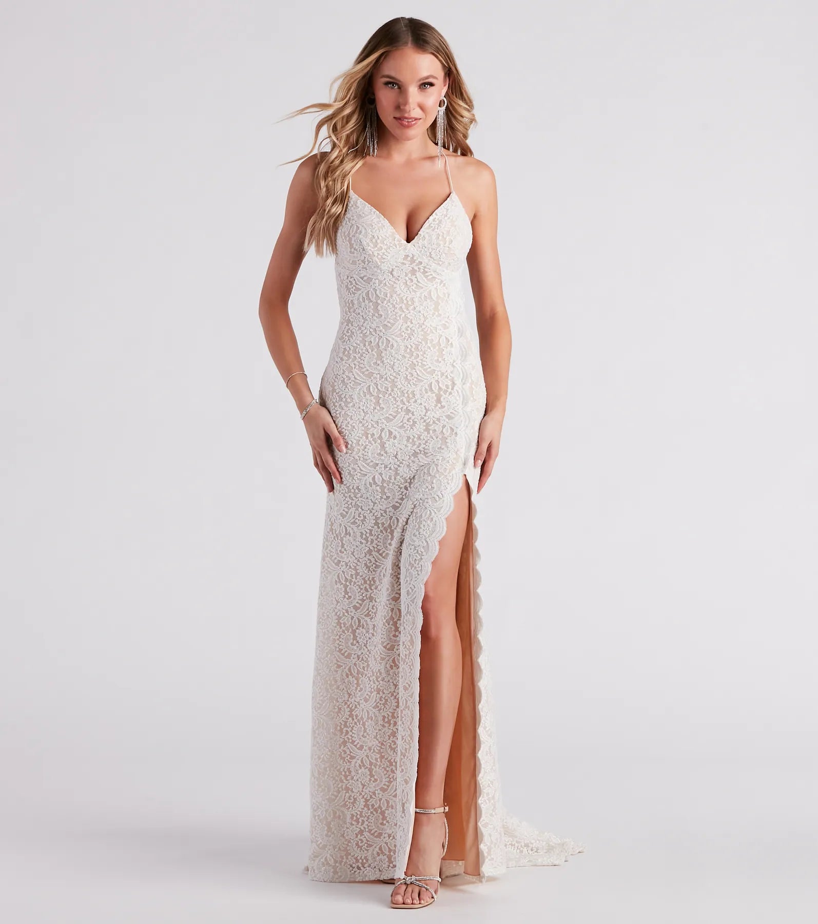 Prepare to enchant in the Cora mermaid formal dress for your grand walk down the aisle or into the school formal! She stuns in a sleeveless V-neckline. sleek bungee spaghetti straps. a lightly padded bust. an open back with cross straps. a hip-hugging mermaid silhouette. a sexy dramatic high-cut front slit along the floor-length hem. and a train accent. The dress is composed of a glitter lace mesh fabric with a stretchy nude knit lining. Style with earrings and platform heels to complete the look!