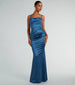 The Courteney satin formal dress knows how to leave every room breathless at galas. weddings. and banquets! She features a cowl neckline and spaghetti straps frame her flattering bodice. while the crisscross back adds a touch of flirty. The side pleated seams and mermaid silhouette hug your curves as the satin fabric cascades into a striking floor-length hem. Complete the look with rhinestone earrings and heels.