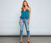 Wrap yourself with a luxe blouse that shows off your affinity for the good life! The blouse features a sleeveless V-neckline. rhinestone straps. rhinestone lace-up front. and a cropped hem. The blouse is composed of a satin-like fabric that offers a relaxed fit with minimal stretch. Complete look with high waist jeans.