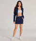 This cute denim mini skirt features a classic high-rise waist. front pockets for stylish convenience. and a form-hugging fit. Perfect for everyday styling.