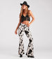 Keep your festival 'fit on trend with these adorable cow print flare pants! They feature a high-rise waist. a hip-hugging fit. a form-hugging fit throughout the legs. and a flared hem. The stretchy brushed knit fabric features an all-over cow print pattern. Style with a crop top and boots for a country concert!