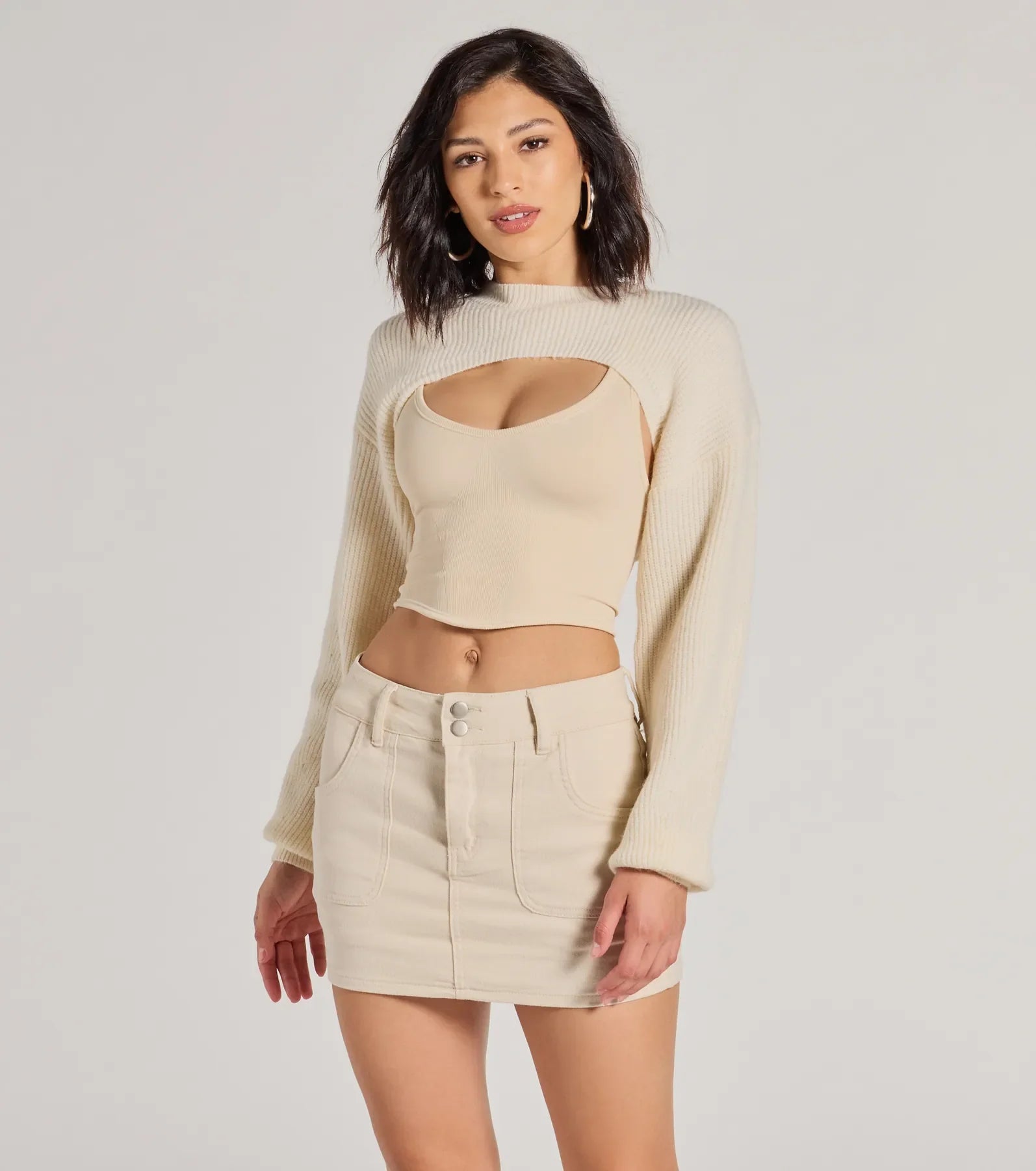 Keep cozy and look like a babe in this sweater knit topper crafted on soft fabric with long sleeves and an ultra-cropped hem. Complete the look with a crop top.