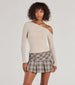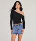Cozy and on-trend. this ribbed hacci knit top features an asymmetric off-shoulder neckline with long fitted sleeves and a mid-length hem with a form-hugging fit. Style with a plaid skirt and ankle booties!