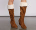 Channel those cozy vibes in these boots that are perf to go with your cold-weather outfits. The boots feature a sherpa-lined cuff. a below the knee fit. an inner zipper closure. an almond toe. and a wedge heel. The boots are composed of faux suede material. Complete your look with a plaid mini skirt and cozy cardigan.