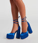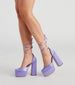 Go ahead. crash the party looking so stunning in these satin platform heels featuring a closed almond toe and ankle. block heel. lace-up straps with self-tie closure. and chunky silhouette. Complete the look in a sassy skater dress.