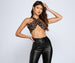 Make a fierce impression with a crop top that dares to go bold! The top features a leopard print. a halter neck. a criss-cross bodice. and a racerback. The top is composed of a mesh fabric that offers a form hugging fit with a moderate stretch. Complete look with high waist faux leggings and heels.