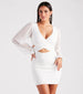 You'll be coveting this crepe short dress to wear for all of your dressy occasions! The dress features chiffon peasant sleeves. a V-neck. cutouts along the wrap waist. and a short. curve-hugging silhouette. The crepe fabric offers a moderate stretch. Perfect for styling with fringe earrings and heels.