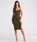 This ribbed knit midi dress is cute. casual. and perf for everyday styling! It features a sleeveless V-neckline. spaghetti straps. a midi-length hem with a side slit accent. and a form-hugging silhouette. The ribbed knit fabric offers plenty of stretch. Pair with a cropped denim jacket and strappy mules.