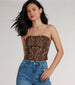 Go for a cute country look in this faux leather corset top to adorn your music festival outfit or concert and hitting up a bar with the girls! Made with faux leather lined fabric. this strapless top features a non-slip grip lining and hidden back multiple hook and eye fasteners for a perfect fit. Complete with western-inspired stitch detailing and a cropped hem. this corset will have you looking and feeling so cute! Style with trendy denim shorts and cowboy boots for a perfect look!