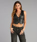 Layer on street-cute with this faux leather vest. Designed with lace-up stitch designs. grommet trim. and button accents. it's a fierce piece for layering or wearing solo.