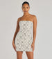 This adorable mini dress is embroidered with the cutest sequin bow pattern on lined mesh fabric to capture those trendy coquette vibes! The short dress features a strapless straight neckline. a satin ribbon lace-up back design for a customized fit. and a fitted A-line silhouette. Perfect for a party. style with metallic heels.