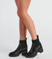 Hey. there cutie rocking these lug sole booties! They feature a round toe. chunky block heel. and rib-knit upper design on faux leather material. Complete the look in a flannel shacket for cold-weather vibes.