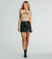 Stay on the cutting edge of style in this faux leather mini skort perfect for any plans! The high-rise belted waist and form-hugging fit highlight your curves. while the skirt overlay adds a trendy touch with back pockets and a mini-length hem. Includes a knit shorts lining. Complete the look in a sassy graphic top.