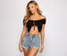 You'll fall in love with the dainty details of this pretty lace crop top! It features an off-the-shoulder neckline with a ruffled trim. short fitted sleeves. a double tie-front design. an open front. and a cropped. form-hugging fit. The sheer lace fabric has a front lining. Style this top with cutoff denim shorts and sandals.