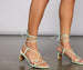 The details make these heels a stunning accent to your look! The heels feature sleek lace-up straps. an open back. sleek asymmetrical straps over the toe. an open square toe. and a low block heel. The heels are composed of a faux leather material. Complete look with a white mini dress and butterfly earrings.