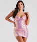 You'll be the center of attention on the dance floor in this dazzling sequin mini dress! It features a sleeveless V-neckline. dual bungee spaghetti straps. a backless design with cross-back straps. a mini-length hem. and a bodycon silhouette that will hug your curves. The lined mesh fabric features all-over sequin embroidery with a stunning iridescent hue that will catch the light. Complete your look with clear heels.