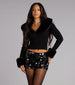 Dance the night away in this sequin mini skirt flaunting a high-rise waist and form-hugging fit. Complete the look with a crop top and heels.