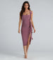 Dare to be noticed in this effortless midi dress perfect for dressy soirees and dates! Capture the moment in this knee-length dress featuring a square neckline. adjustable spaghetti straps. a cascading front ruffle trim. a flattering bodycon silhouette. and a sultry side slit on slinky knit fabric. Complete the look in block heels and a clutch.