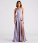 Gracefully glide into the night in the Daria ball gown designed to shine at formal dances. black-tie events. and charity auctions! She features a sleeveless square neck. adjustable spaghetti straps for a customizable fit. a lightly padded bust. and a romantic lace-back panel. Her empire waist seam leads to the flattering A-line silhouette with hidden side pockets to keep your hands warm and a sultry asymmetrical floor-length hem with a high-cut front slit. The ball gown is composed of a shimmery knit fabric with a stretchy knit lining. Style with a bracelet and hair barrette to complete the look!