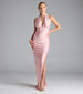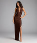 Dare to be sultry in the Darla floor-length formal dress boasting a plunge halter V-neckline. revealing open back with a chic bow tie. and a high side slit to show off your heels of the night.
