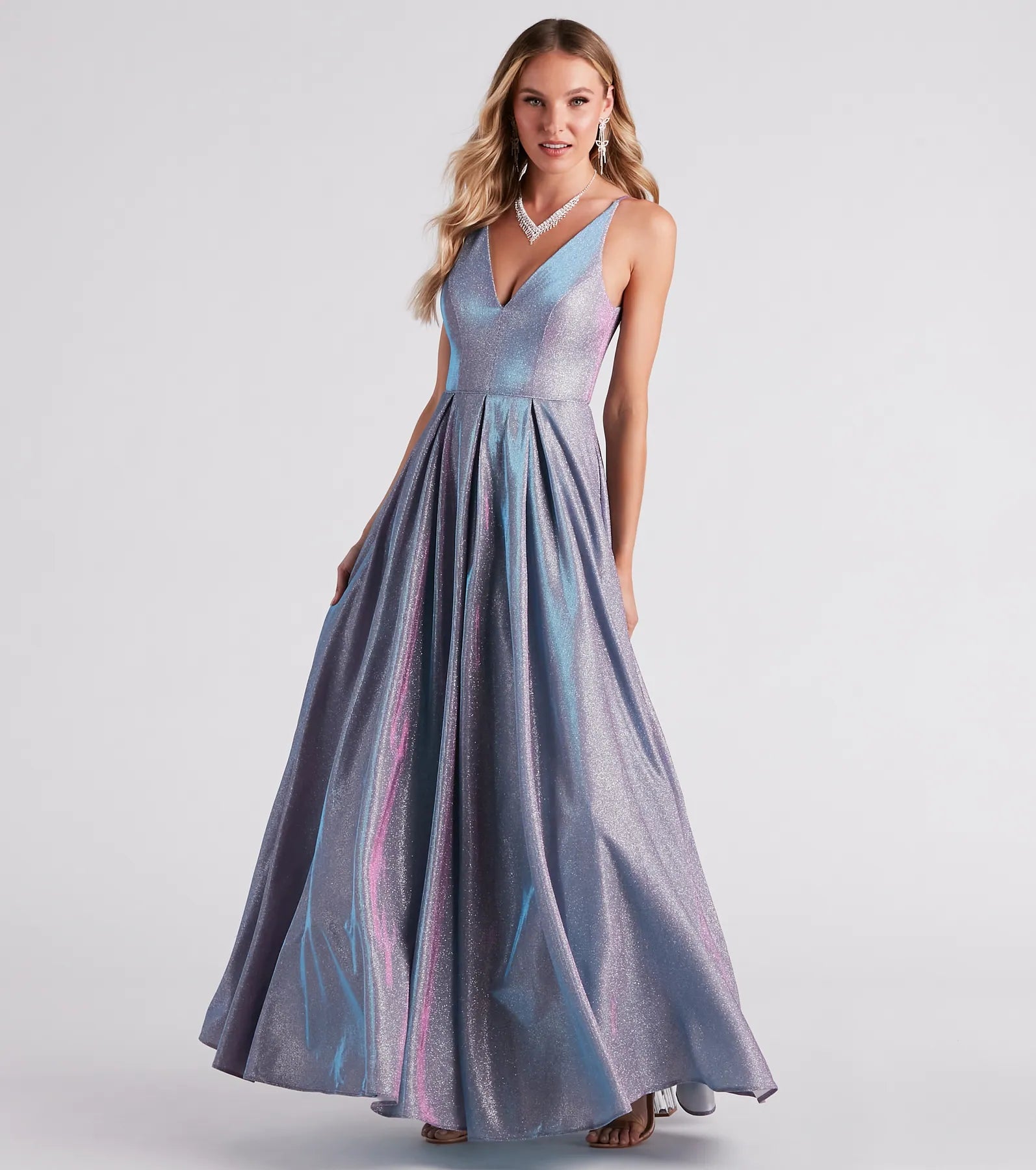 Radiate princess vibes in the stunning Delaney A-line glitter ball gown! The gown has hidden side pockets to keep your hands warm and a voluminous twirl-worthy silhouette.