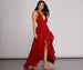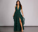 Create a twirl worthy moment in our charming Delena dress! She features an all over emerald green hue. a halter neckline with wide neck tie straps. a plunging V neck bust and an open back. Her slim fit bodice leads to a sweeping floor length silhouette accented with dreamy tendril accents and a high slit. She includes a built in bodysuit lining with a thong bottom and snap button closure. Dress is composed of a lined chiffon fabric that offers a relaxed fit with minimal stretch. Includes a lower back zipper closure.