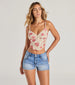 Delicate blooms romanticize this floral lace crop top perfect for a charming look all summer! Features adjustable spaghetti straps for a perfect fit. a flattering V-neckline adorned with a beautiful bow. and a fitted crop hem. Complete the look in denim shorts and sneakers.