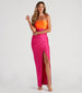 Paint the town vibrant hues showing up to the party in the Denise formal long dress! She features a sleeveless square neck. spaghetti straps. and a side pleated seam that accentuates your curves along her form-hugging. asymmetrical slit wrap-long hem. The formal dress is composed of a slinky knit fabric with moderate stretch. Complete your eye-catching look in PVC strap block heels for a celebration!