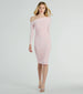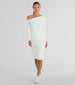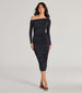 The perfect dinner date starts with this off-the-shoulder midi dress and ends with cocktails on the patio! The double-lined smooth knit fabric ensures a comfortable and smooth feel. while the midi-length hem adds a touch of elegance. With its fitted long sleeves and ruched side seams. it offers a flattering bodycon fit that accentuates your curves. Complete the look in mules.