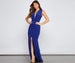 Take the plunge into style with a formal dress that wows! Dorothea features a sleeveless plunging V-neckline. ruching throughout. a high slit. and an A-line silhouette. The dress is composed of a smooth knit fabric that offers a form hugging fit with a moderate stretch. Complete look with rhinestone heels and a tennis bracelet.