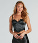A satin corset top worthy of double takes! It features a sweetheart neckline with applique trim. adjustable spaghetti straps. and underwire bust for support. The flexible boning helps to flaunt your figure while the curved cropped hem showcases a unique applique trim. Style with the matching mini skirt to complete the look for a date or birthday dinner!