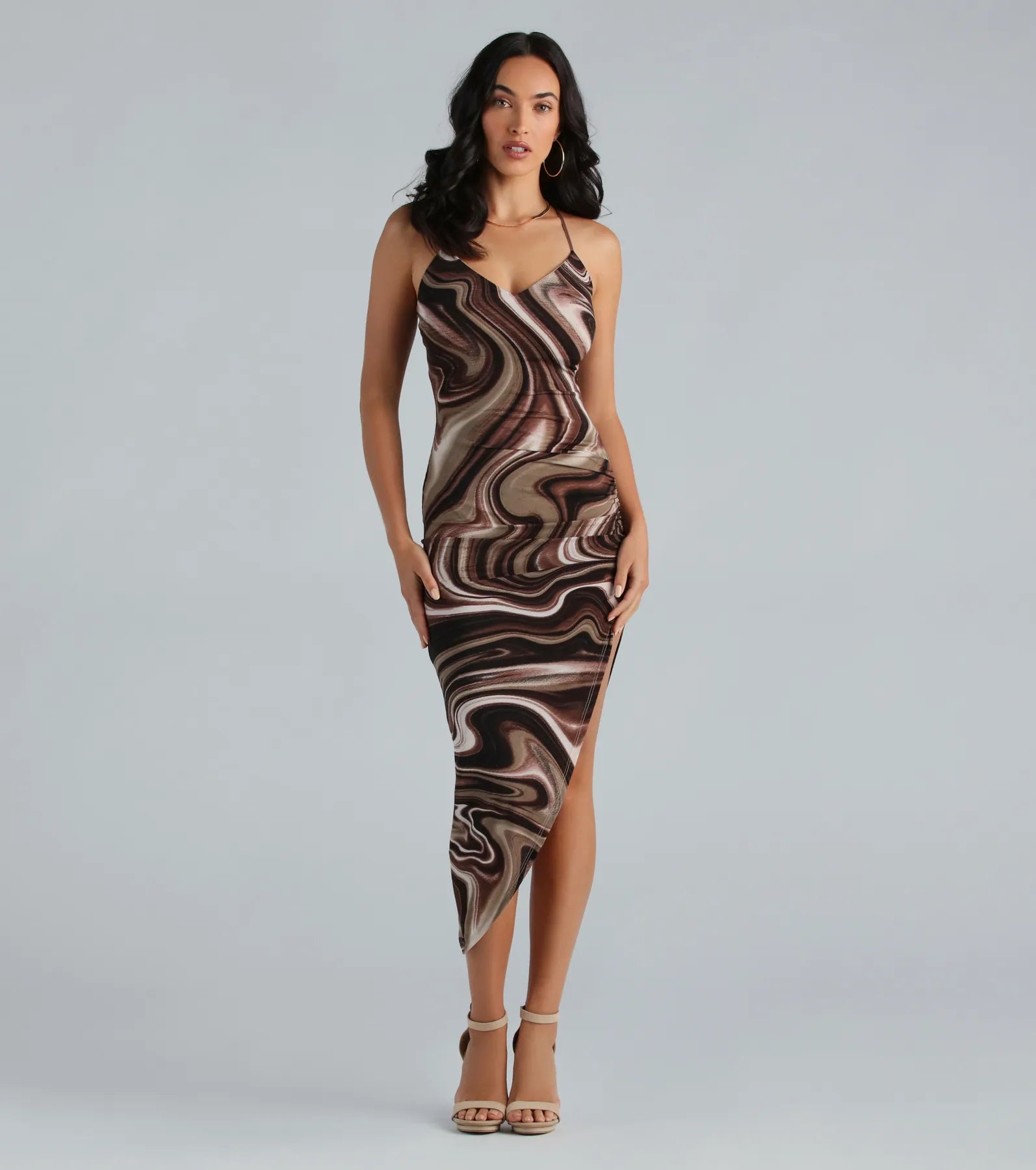 Finished with a gorgeous marble print. this midi dress will be the star of the night! The knee-length dress features a sleeveless V-neckline. adjustable spaghetti straps. a crisscross back. and a bodycon silhouette and side ruched seam that flatters your curves. while the asymmetrical midi-length hem and high side slit show off your legs. Style the midi dress with basic stiletto heels for a sunset dinner.
