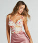 Captivate them all with your dreamy beauty in this floral ruched mesh corset top. Designed with a lightweight mesh fabric accented with a gorgeous floral print pattern. this corset top will have you dressed to impress. It features a sleeveless sweetheart neckline with a sweet ruffled trim. padded cups so you don't need to wear a bra. and thin tank straps that lead to back adjustable spaghetti straps for a customized fit. The front is detailed with ruching and hook and eye closures. followed by a fitted. angled. and cropped hem for a chic look. Style with a satin midi skirt and mules for a spring party!