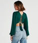 Get a dreamy-chic look for date night with this sleek satin cropped blouse! It features a deep V-neckline with a wrap-front. long peasant sleeves with smocked hems. a lace-up back design. and a cropped. form-hugging fit. The lightweight woven satin fabric has no stretch. Style with faux leather pants and heels.