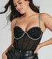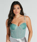 This gorgeously detailed pearl and rhinestone trim bustier top will give you a dreamy vibe for your party plans! It features a sleeveless sweetheart neckline with pleated mesh fabric at the bust. a rhinestone faux pearl-embellished chain trim under the bust and on the spaghetti straps. a corset-style bodice with a structured bust and flexible boning for a snatched silhouette. and a fitted. angled. and cropped hem. Complete your look with a midi skirt and metallic heels.