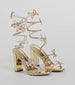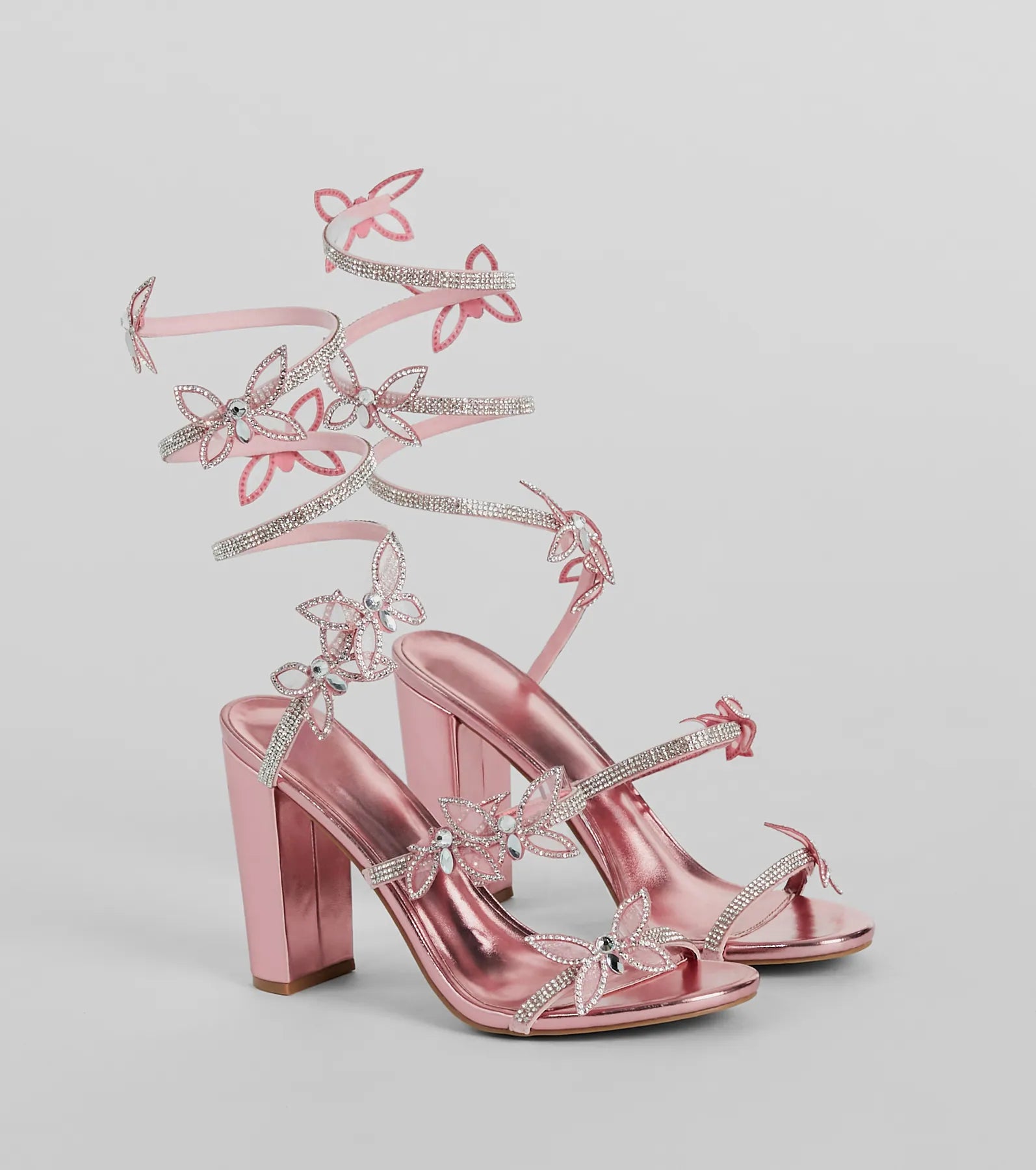 These stunning rhinestone butterfly spiral metallic heels will create the dreamiest formal look so you feel like a true queen! Designed with a fabulous metallic sheen on the faux leather material. these heels feature an open almond-shaped toe. dual straps across the foot. and a glam spiral strap design that wraps around the leg for that trendsetting vibe. The straps are accented with mini rhinestones and glam butterfly appliques with sheer mesh detailing and rhinestones for that gorgeous sparkle. Style these heels with a glitter clutch for an enchanting look!
