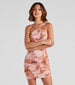 Channel your inner pop princess with this short dress that brings all the glam! The dress features a retro swirl print. a halter neckline with bungee spaghetti straps. dual ruching through hip and hem. and a short length. The dress is composed of a lined mesh fabric that offers a form-hugging fit with a moderate stretch. Complete your look with butterfly clips and chrome heels.