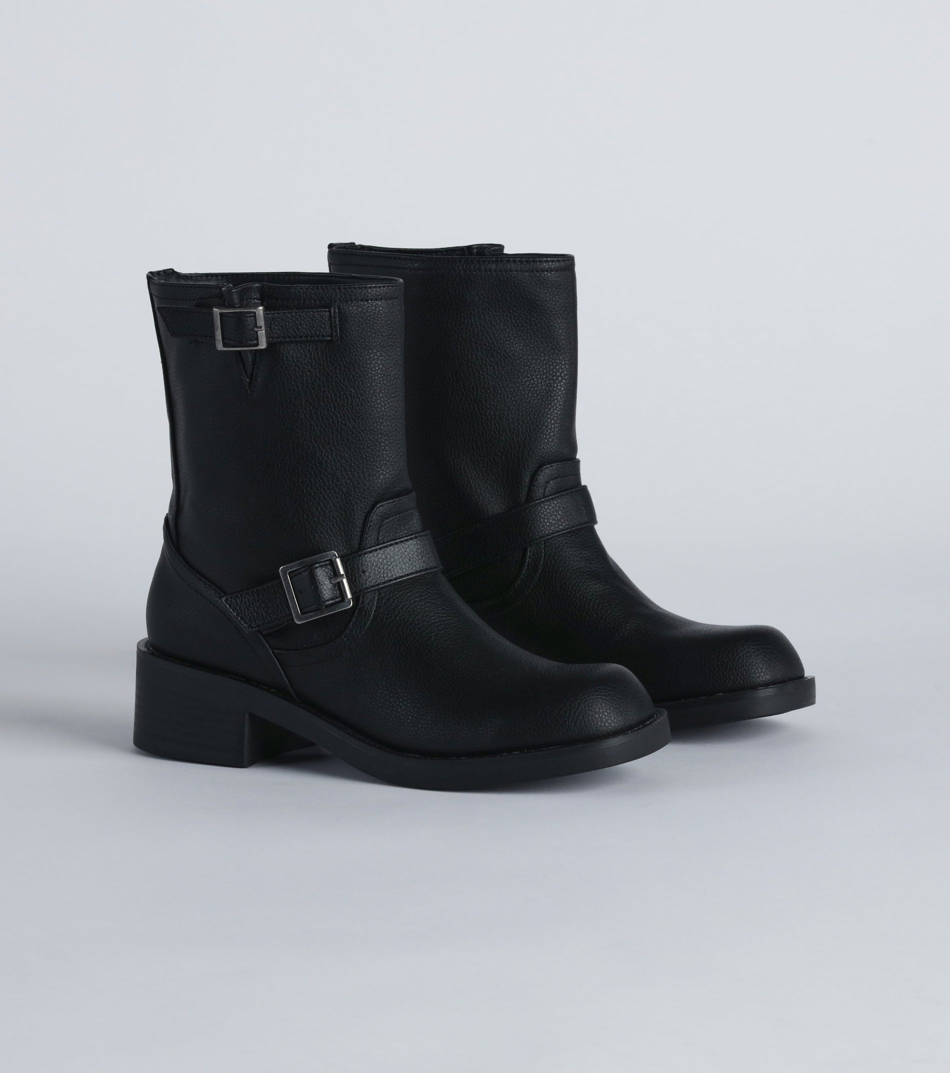 Edge up your fall 'fits with this pair of trendy faux leather biker boots. They feature an above-the-ankle height with a square toe. dual straps with buckle accents. a low block heel for comfortable wear. and are made from a smooth faux leather material. Style these biker boots with a bomber jacket and hoop earrings.