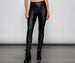 Bring major edgy appeal with pants that dare to go bold. The pants feature a mid-rise waist. dual vertical seams on the legs. an exposed side zipper closure with mini O-Ring. and a skinny leg fit. The pants are composed of a coated stretchy knit fabric that offers a form hugging fit with a moderate stretch. Complete look with a graphic tee and combat boots.