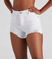 These denim shorts are all you need to nail an edgy fab vibe! These bold must-haves feature a high-rise waist. a single button with hidden zipper closure. a traditional five-pocket with belt loop design. heavy destruction. and a raw edge hem. The denim shorts offer a form hugging fit with slight stretch. Complete look with a fringe vest and boots!Â