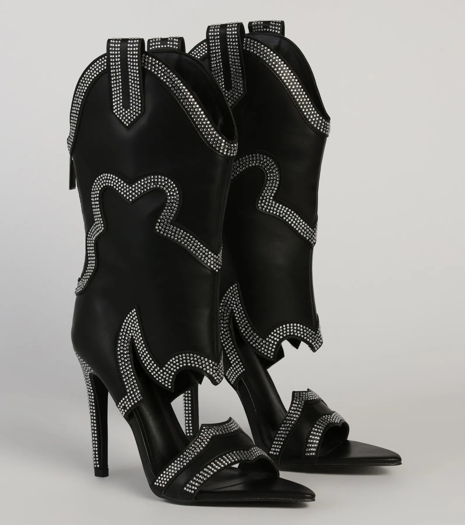 These faux leather western heeled boots will put you in an edgy style mood! They feature a below-the-knee height with pull tabs on each side. an open pointed toe. an angled toe strap. an angled cutout across the foot. a stiletto heel. and a back zipper closure for easy on-and-off wear. The sleek faux leather material features a western-style design with mini rhinestone embellished trims. Style these heeled boots with a bodycon dress and rhinestone fringe earrings for a country concert!