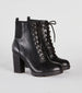 These sleek and trendy heeled combat booties are edgy perfection! They feature an above-the-ankle fit. an almond toe. a lace-up front design. an elastic gore detail and pull tab accent at the ankle. an inner zipper closure. and a tall block heel with a lug sole. Style these faux leather booties with a chic crossbody bag.