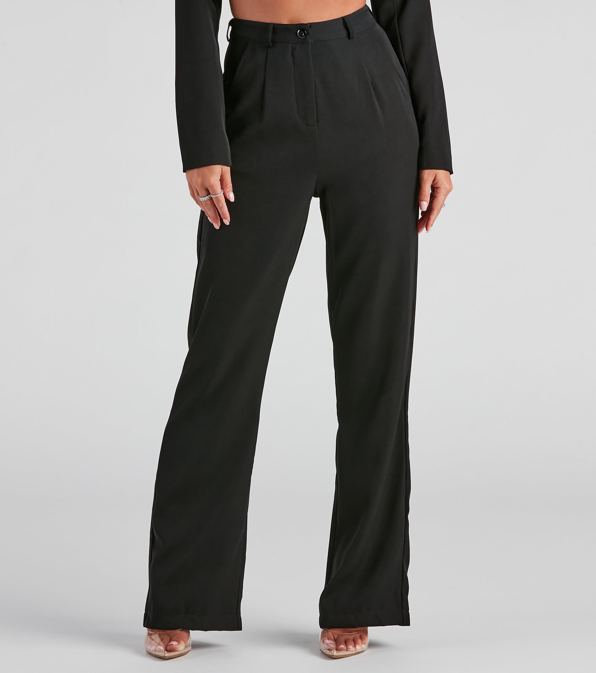 Effortless and elevated. create chic looks with these woven pants. They feature a high-rise waist. belt loops. a button-front closure. front and back pockets. and a wide-leg silhouette. Style with the matching cropped blazer and clear mules.